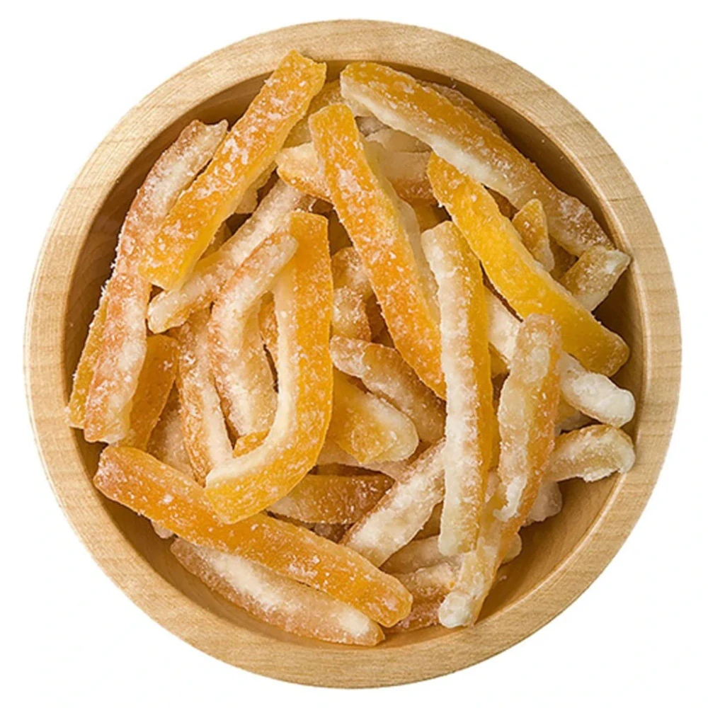 Složení: pomerančová kůra 53%, cukr 34%, regulátor kyselosti - kyselina citrónová E330, sirup glukózo-fruktózový 13%.